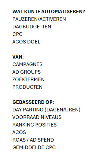 Ook kun je je campagnes optimaliseren obv de voorraad van een product of de organische ranking van jouw producten op een zoekwoord. Is je voorraad bijna op? Dan kun je je campagne voor dit specifieke product pauzeren. Rank je organisch al hoog op een zoekwoord? Verlaag dan automatisch je CPC of pauzeer je campagne. Al deze tooling en meer zit direct in je all-in-one pakket. Wil je graag een demo call, plan deze dan hier in: Plan een afspraak in